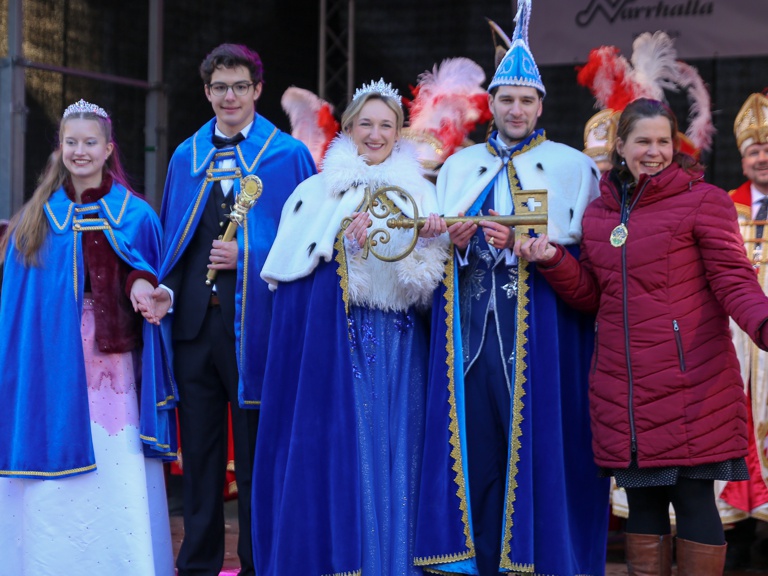 Unser Bürgermeister spricht die Grußworte der Landeshauptstadt und überreicht symbolisch den Stadtschlüssel. Bis Aschermittwoch am 10. Februar übernimmt unser Prinzenpaar somit die närrische Regentschaft der Stadt.