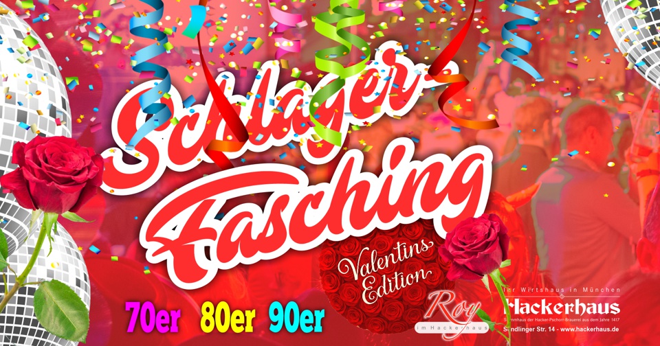 Traditioneller Wirtshausfasching im Alten Hackerhaus und Kult-Schlagerparty im „Roy“ bei Schlagermusik der 60er bis 90er und von heute. Nur ein Ticket für zwei Ebenen voller Faschingsspaß! (ab 2 Uhr früh nur noch im Schlagerclub „Roy“).